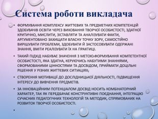 формування комплексу життєвих та предметних компетенцій здобувачів освіти через виховання творчої особистості, здатної критично, мислити, зіставляти та аналізувати факти, аргументовано захищати власну точку зору, самостійно вирішувати проблеми, здобувати й застосовувати одержані знання, вміти реалізувати їх на практиці. Такий підхід набуває значення з метою:формування компетентної особистості, яка здатна, керуючись набутими знаннями, сформованими цінностями та досвідом, приймати доцільні рішення у різних життєвих ситуаціях;створення мотивації до дослідницької діяльності, підвищення інтересу до вивчення предметів. За інноваційним потенціалом досвід носить комбінаторний характер, так як передбачає конструктивні поєднання, інтеграцію сучасних педагогічних технологій та методик, спрямованих на розвиток творчої особистості.