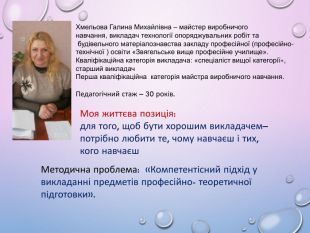 Хмельова Галина Михайлівна – майстер виробничого навчання, викладач технології опоряджувальних робіт та будівельного матеріалознавства закладу професійної (професійно-технічної ) освіти «Звягельське вище професійне училище». Кваліфікаційна категорія викладача: «спеціаліст вищої категорії», старший викладач. Перша кваліфікаційна категорія майстра виробничого навчання. Педагогічний стаж – 30 років. Моя життєва позиція:для того, щоб бути хорошим викладачем– потрібно любити те, чому навчаєш і тих, кого навчаєш. Методична проблема: «Компетентісний підхід у викладанні предметів професійно- теоретичної підготовки».