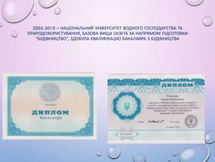 2005-2010 – Національний університет водного господарства та природокористування, базова вища освіта за напрямом підготовки “Будівництво”, здобула кваліфікацію бакалавра з будівництва