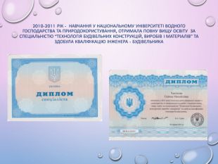 2010-2011 рік - навчання у Національному університеті водного господарства та природокористування, отримала повну вищу освіту за спеціальністю “Технологія будівельних конструкцій, виробів і матеріалів” та здобула кваліфікацію інженера - будівельника