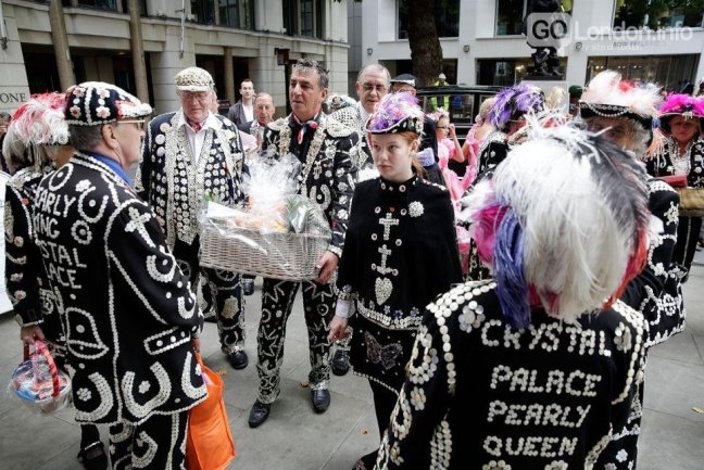 7. Pearly Kings and Queens. The harvest festival of Pearly Kings and Queens of street vendors is an autumn holiday dedicated to harvesting and successful trade. Its participants wear clothes embroidered in pearls. The practice of wearing clothes decorated with pearl buttons, was born in the 19th century, and in 1911 a pearl society was organized in the north of London. Despite the plainness of the material, the costumes of the participants are richly decorated, the weight of each outfit can reach 30 kg. Pearly Kings and Queens sing songs, play on guitars and in every possible way have fun during the festival of harvest.