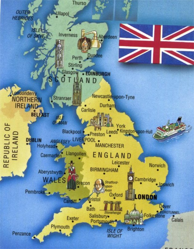 Major cities: Birmingham, Sheffield, Manchester, Bristol in England; Glasgow, Edinburgh and Aberdeen in Scotland; Cardiff, Swansea and Newport in Wales; Belfast in Ulster.