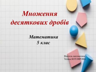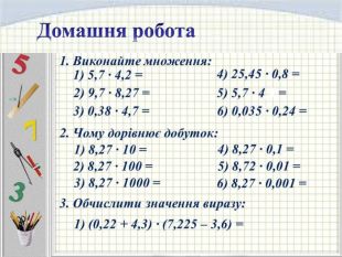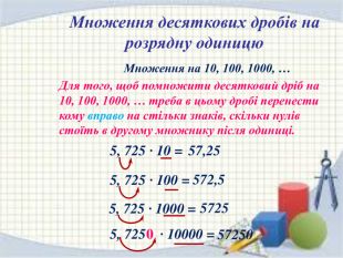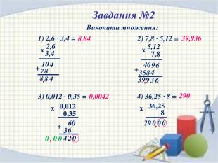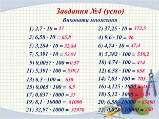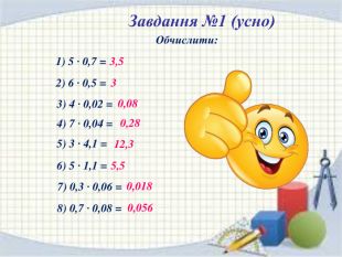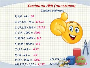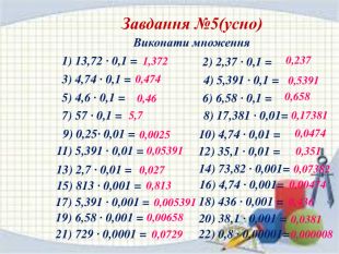 Завдання №5(усно)Виконати множення1) 13,72 · 0,1 = 2) 2,37 · 0,1 = 3) 4,74 · 0,1 = 4) 5,391 · 0,1 = 5) 4,6 · 0,1 = 6) 6,58 · 0,1 = 7) 57 · 0,1 = 8) 17,381 · 0,01= 9) 0,25· 0,01 = 10) 4,74 · 0,01 = 11) 5,391 · 0,01 = 12) 35,1 · 0,01 = 22) 0,8 · 0,00001= 14) 73,82 · 0,001= 15) 813 · 0,001 = 13) 2,7 · 0,01 = 17) 5,391 · 0,001 = 18) 436 · 0,001 = 19) 6,58 · 0,001 = 20) 38,1 · 0,001 = 21) 729 · 0,0001 = 16) 4,74 · 0,001= 1,3720,4740,2370,53910,460,6585,70,173810,00250,04740,053910,3510,0270,073820,8130,004740,0053910,4360,006580,03810,0000080,0729