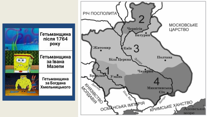 Українська козацька держава «Військо Запорозьке»Генеральна військова рада – вищий законодавчий орган. Старшинська рада – генеральна старшина, полковники. Гетьман – глава держави, мав вищу виконавчу та судову владу. Генеральна старшина – уряд, що відав поточними справами внутрішнього і зовнішнього управління: Генеральний писар (канцелярія, діловодство) Генеральний обозний (артилерія, матеріальне забезпечення армії) Два генеральні осавули (помічники гетьмана)Два генеральні суддіГенеральний підскарбій (фінанси)Хорунжий і бунчужний