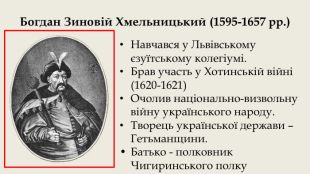 Початок Національно-визвольної війни. Приводом до початку повстання, що переросло в Національно-визвольну війну, стала особиста кривда, заподіяна Б. Хмельницькому чигиринським підстаростою Даніелем Чаплинським. Зі своїми слугами він пограбував та зруйнував родинний хутір Б. Хмельницького Суботів, забрав його дружину та жорстоко побив малолітнього сина. Звернення Б. Хмельницького до суду й навіть до короля з вимогами покарати нападника не мали результатів. Не знайшовши справедливості, він приєднався до козацької старшини, яка таємно обговорювала план повстання проти польської влади в Україні. Протягом вересня 1647 р. Б. Хмельницький розробив план виступу проти Речі Посполитої. Повстання вирішили розпочати в листопаді 1648 р. захопленням Трахтемирова, де був урядовий комісар реєстрового козацтва Яцек Шемберк.