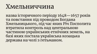 Періодизація Національно-визвольної війни українського народу середини XVII ст.{09 A8 AEB1-0 F68-4 DF2-A324-8 F663 CB0463 B}Період. Зміст1648—1649 рр. Наростання визвольної боротьби. Визнання урядом Речі Посполитої певної самостійності за Україною1650—1653 рр. Тривала й виснажлива боротьба між козацтвом і поляками не принесла успіху жодній зі сторін1654—1655 рр. Надання Московською державою військової допомоги Україні. Успішне завершення українсько-московськими військами літньо-осінньої кампанії 1655 р. в Україні1656—1657 рр. Укладення Україною військового союзу зі Швецією та Трансильванією. Спільні дії козацтва зі шведською та трансильванською армією проти Польщі.
