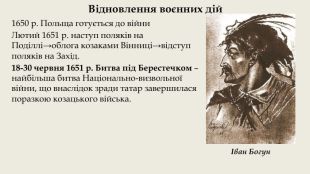 Відновлення воєнних дій1650 р. Польща готується до війни. Лютий 1651 р. наступ поляків на Поділлі→облога козаками Вінниці→відступ поляків на Захід. 18-30 червня 1651 р. Битва під Берестечком – найбільша битва Національно-визвольної війни, що внаслідок зради татар завершилася поразкою козацького війська.Іван Богун