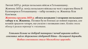 Лютий 1653 р. рейди польських військ в Гетьманщину. Жовтень 1653 р. похід польського війська на чолі з королем Яном ІІ Казимиром в Гетьманщину – табір поляків у м. Жванець біля Кам'янця. Жовтень-грудень 1653 р. облога козаками і татарами польського табору в м. Жванець. Поляки були близькі до повної поразки, але козаків зрадили татари, що уклали з поляками союз. Козаки зняли облогу й уклали перемир'я з поляками. Гетьман більше не довіряв татарам і почав шукати нового союзника задля збереження здобутків війни – Козацької держави. Новим союзником стало Московське царство.