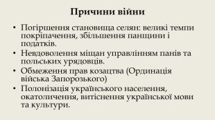 Причини війни. Погіршення становища селян: великі темпи покріпачення, збільшення панщини і податків. Невдоволення міщан управлінням панів та польських урядовців. Обмеження прав козацтва (Ординація війська Запорозького)Полонізація українського населення, окатоличення, витіснення української мови та культури.
