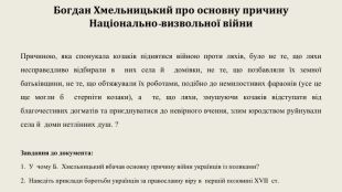 Богдан Хмельницький про основну причину Національно-визвольної війни Причиною, яка спонукала козаків піднятися війною проти ляхів, було не те, що ляхи несправедливо відбирали в них села й домівки, не те, що позбавляли їх земної батьківщини, не те, що обтяжували їх роботами, подібно до немилостивих фараонів (усе це ще могли б стерпіти козаки), а те, що ляхи, змушуючи козаків відступати від благочестивих догматів та приєднуватися до невірного вчення, злим юродством руйнували села й доми нетлінних душ. ? Завдання до документа:1. У чому Б. Хмельницький вбачав основну причину війни українців із поляками? 2. Наведіть приклади боротьби українців за православну віру в першій половині XVII ст.