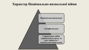 Завдання Національно-визвольної війни1. Визволити Україну з-під влади шляхетської Польщі, знизити польське панування, стати на шлях самостійного розвитку.2. Скинути гноблення польських феодалів і польсько-шляхетської адміністрації.3. Ліквідувати велику феодальну власність на землю, скасував ти кріпацтво та утвердити козацький тип господарювання.4. Створити в етнічних межах України власну державу.5. Обстоювати і захищати національну незалежність.