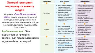 Основні принципи порятунку та захисту людей. Формула «Запобігати, уникати, діяти» описує принципи безпечної життєдіяльності, дотримання яких зменшує ризики щоденного життя й дає можливість врятувати людей при НС. (стор. 11 мал. 2)Зробіть висновок : Чим відрізняються принципи безпеки для людей і держави в надзвичайних ситуаціях?
