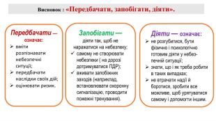 Передбачати — означає:вміти розпізнавати небезпечні ситуції;передбачати наслідки своїх дій;оцінювати ризик. Діяти — означає:не розгубитися, бути фізично і психологічно готовим діяти у небезпечній ситуації;знати, що і як треба робити в таких випадках;не втрачати надії й боротися, зробити все можливе, щоб урятуватися самому і допомогти іншим. Запобігати — діяти так, щоб не наражатися на небезпеку;самому не створювати небезпеки ( на дорозі дотримуватися ПДР);вживати запобіжних заходів (наприклад, встановлювати охоронну сигналізацію, проводити пожежні тренування). Висновок : «Передбачати, запобігати, діяти».