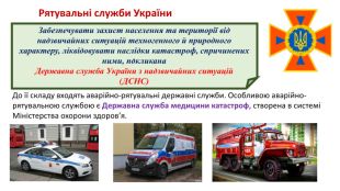 . Забезпечувати захист населення та території від надзвичайних ситуацій техногенного й природного характеру, ліквідовувати наслідки катастроф, спричинених ними, покликана Державна служба України з надзвичайних ситуацій (ДСНС)Рятувальні служби України. До її складу входять аварійно-рятувальні державні служби. Особливою аварійно-рятувальною службою є Державна служба медицини катастроф, створена в системі Міністерства охорони здоров’я.