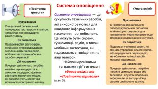 Система оповіщення — це сукупність технічних засобів, які використовуються для швидкого інформування населення про небезпеку. Це можуть бути сирени, гучномовці, радіо, а також мобільні застосунки, які надсилають сповіщення на ваш телефон. Найпоширенішими сигналами цієї системи є «Увага всім!» та «Повітряна тривога» (мал. 3). Система оповіщення