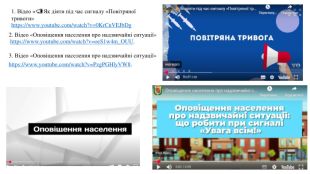 1. Відео «📣Як діяти під час сигналу «Повітряної тривоги»https://www.youtube.com/watch?v=0 Kr. Cn. VEJb. Dg2. Відео «Оповіщення населення про надзвичайні ситуації» https://www.youtube.com/watch?v=oe. S1w4m_OUU.3. Відео «Оповіщення населення про надзвичайні ситуації»https://www.youtube.com/watch?v=Pzg. PGHly. VW8.