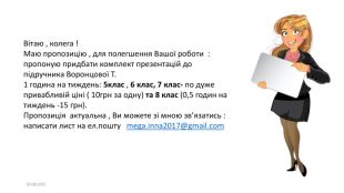 19.08.2025 Вітаю , колега ! Маю пропозицію , для полегшення Вашої роботи : пропоную придбати комплект презентацій до підручника Воронцової Т. 1 година на тиждень: 5клас , 6 клас, 7 клас- по дуже привабливій ціні ( 10грн за одну) та 8 клас (0,5 годин на тиждень -15 грн). Пропозиція актуальна , Ви можете зі мною зв’язатись : написати лист на ел.пошту mega.inna2017@gmail.com