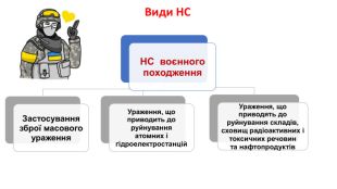 Види НС за походженням: • природного;• техногенного;• соціального і соціально-політичного;• воєнного характеру. Рівні НС за територіальним охопленням та обсягами збитків: Класифікація НС : за офіційною класифікацією надзвичайних ситуацій в Україні розрізняють чотири їх види та чотири рівні. НС державного рівня — це така, що поширилась на територію декількох регіонів України й може поширитися на територію інших держав. НС регіонального рівня — це така, що поширилась на територію декількох районів (міст обласного значення). НС місцевого рівня — це така, що вийшла за межі території небезпечного об’єкта, загрожує довкіллю, сусіднім населеним пунктам, інженерним спорудам