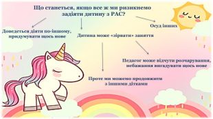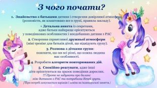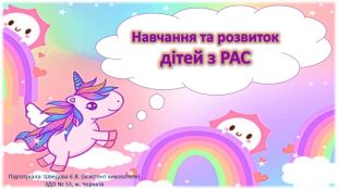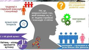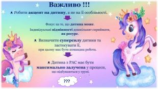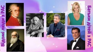 Презентація призначена для того, щоб познайомити аудиторію з тим, що кожен бачить оточуючий світ по-різному; щоб наблизити слухачів до розуміння сприйняття його через призму бачення людей з РАС. У ній надані початкові кроки в організації навчання та розвитку таких діток. Також вказано кілька відомих людей та батьків дітей з РАС: Моцарт, Енштейн, Дарвін. Серед батьків - Сталоне, Траволта, Дженні Маккарті.