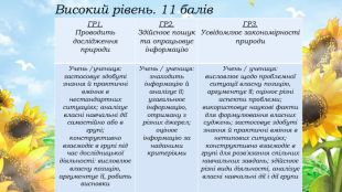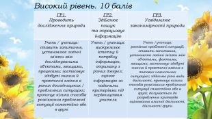 {5 C22544 A-7 EE6-4342-B048-85 BDC9 FD1 C3 A}ГР1. Проводить дослідження природи. ГР2. Здійснює пошук та опрацьовує інформацію. ГР3. Усвідомлює закономірності природи. Учень /учениця:застосовує здобуті знання й практичні вміння в нестандартних ситуаціях; аналізує власні навчальні дії самостійно або в групі;конструктивно взаємодіє в групі під час дослідницької діяльності: висловлює власну позицію, аргументує її, робить висновки. Учень / учениця:знаходить інформацію й аналізує її; узагальнює інформацію, отриману з різних джерел;оцінює інформацію за наданими критеріями. Учень / учениця:висловлює щодо проблемної ситуації власну позицію, аргументує її; оцінює різні аспекти проблеми; використовує наукові факти для формулювання власних суджень; застосовує здобуті знання й практичні вміння в нетипових ситуаціях;конструктивно взаємодіє в групі для розв'язання спільних навчальних завдань; здійснює різні види діяльності, аналізує власні навчальні дії і дії групи. Високий рівень. 11 балів