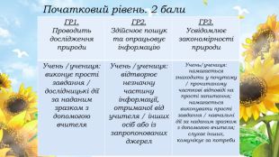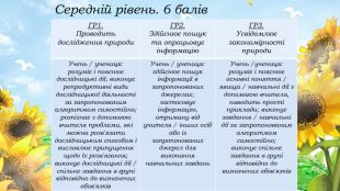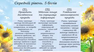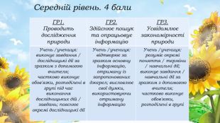 {5 C22544 A-7 EE6-4342-B048-85 BDC9 FD1 C3 A}ГР1. Проводить дослідження природи. ГР2. Здійснює пошук та опрацьовує інформацію. ГР3. Усвідомлює закономірності природи. Учень /учениця:виконує завдання / дослідницькі дії за зразком з допомогою вчителя;частково виконує обов'язки, розподілені в групі під час виконання дослідницьких дій / завдань; пояснює окремі дослідницькі діїУчень /учениця:відтворює за зразком основну інформацію, отриману із запропонованих джерел; висловлює свої думки, використовуючи отриману інформацію. Учень /учениця:розуміє окремі поняття / терміни / навчальні дії; виконує завдання / навчальні дії за зразком з допомогою вчителя;частково виконує обов'язки, розподілені в групіСередній рівень. 4 бали
