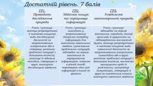 {5 C22544 A-7 EE6-4342-B048-85 BDC9 FD1 C3 A}ГР1. Проводить дослідження природи. ГР2. Здійснює пошук та опрацьовує інформацію. ГР3. Усвідомлює закономірності природи. Учень /учениця:виконує репродуктивні й частково-пошукові види дослідницької діяльності за запропонованим алгоритмом або в співпраці; розпізнає проблемні ситуації з допомогою вчителя, розв'язує їх відомим способом; співпрацює в групі, виконуючи дослідницькі завдання. Учень /учениця:знаходить у запропонованих джерелах потрібну інформацію для виконання навчальних завдань і розв'язання проблемних ситуацій;відповідає на окремі запитання за опрацьованою інформацією, поданою в різний спосіб; перетворює один вид інформації в інший за зразком. Учень /учениця:відповідає на окремі запитання, наводить типові приклади й аргументи на підтвердження висловленої думки; виконує репродуктивні й частково-пошукові види навчальної діяльності за запропонованим алгоритмом самостійно або в групі;розпізнає проблемні ситуації з допомогою вчителя, висловлює припущення щодо їх розв'язання; налагоджує комунікацію, співпрацює в групі за погодженим планом, виконуючи навчальні завдання. Достатній рівень. 7 балів