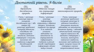 {5 C22544 A-7 EE6-4342-B048-85 BDC9 FD1 C3 A}ГР1. Проводить дослідження природи. ГР2. Здійснює пошук та опрацьовує інформацію. ГР3. Усвідомлює закономірності природи. Учень / учениця:виконує окремі пошукові, дослідницькі та / або творчі дії;розв'язує проблемні ситуації відомими способами під керівництвом вчителя; активно співпрацює з іншими, визначає свої завдання в груповій дослідницькій діяльностіУчень / учениця:аналізує інформацію, отриману з обраних джерел, зіставляє, порівнює та групує її за заданою ознакою;відповідає на запитання за опрацьованою інформацією, поданою в різний спосіб; перетворює інформацію одного виду в інший. Учень /учениця:розпізнає проблемні ситуації, розв'язує їх відомим способом з допомогою вчителя;відповідає на запитання, доповнює думку / відповіді однокласників; виконує окремі навчальні дії;активно співпрацює з іншими, виконуючи навчальні завдання,визначає свої завдання в групі; залучає інших до співпраці в межах запропонованої теми. Достатній рівень. 8 балів