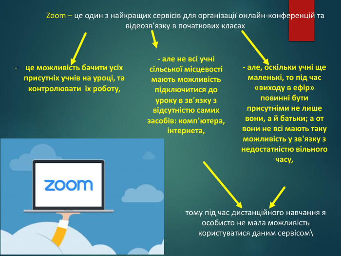 Zoom – це один з найкращих сервісів для організації онлайн-конференцій та відеозв’язку в початкових класахце можливість бачити усіх присутніх учнів на уроці, та контролювати їх роботу,- але не всі учні сільської місцевості мають можливість підключитися до уроку в зв'язку з відсутністю самих засобів: комп'ютера, інтернета, тому під час дистанційного навчання я особисто не мала можливість користуватися даним сервісом\- але, оскільки учні ще маленькі, то під час «виходу в ефір» повинні бути присутніми не лише вони, а й батьки; а от вони не всі мають таку можливість у зв'язку з недостатністю вільного часу,