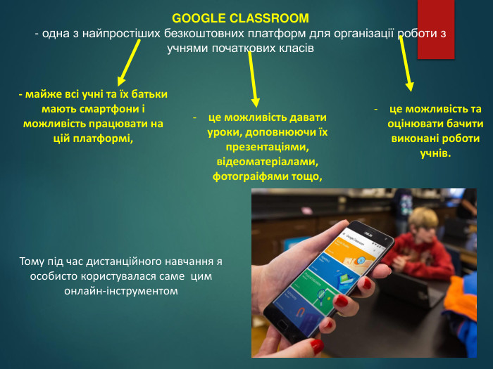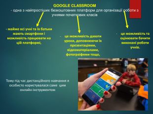 Google Classroom- одна з найпростіших безкоштовних платформ для організації роботи з учнями початкових класів- майже всі учні та їх батьки мають смартфони і можливість працювати на цій платформі,це можливість давати уроки, доповнюючи їх презентаціями, відеоматеріалами, фотограіфями тощо,це можливість та оцінювати бачити виконані роботи учнів. Тому під час дистанційного навчання я особисто користувалася саме цим онлайн-інструментом