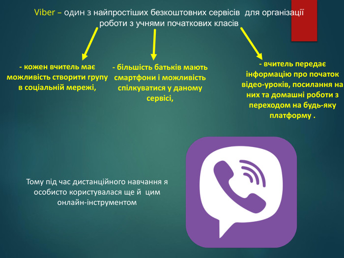 Viber – один з найпростіших безкоштовних сервісів для організації роботи з учнями початкових класів - кожен вчитель має можливість створити групу в соціальній мережі,- вчитель передає інформацію про початок відео-уроків, посилання на них та домашні роботи з переходом на будь-яку платформу .- більшість батьків мають смартфони і можливість спілкуватися у даному сервісі,Тому під час дистанційного навчання я особисто користувалася ще й цим онлайн-інструментом