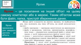 Ярлик5 Розділ І.§ 1.6 Ярлик – це посилання на інший об'єкт на цьому самому комп'ютері або в мережі. Таким об'єктом може бути файл, папка, пристрій збереження даних. Ярлик призначено для швидкого доступу до об'єкта.