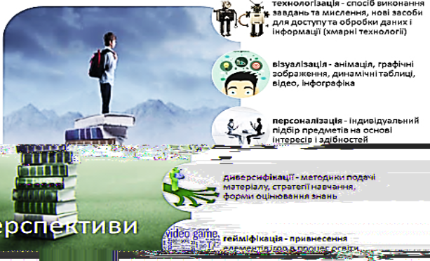 Для загальної освіти (початкова та базова школи) це означає домінування процесів технологізації, візуалізації, персоналізації, диверсифікації, гейміфікації.