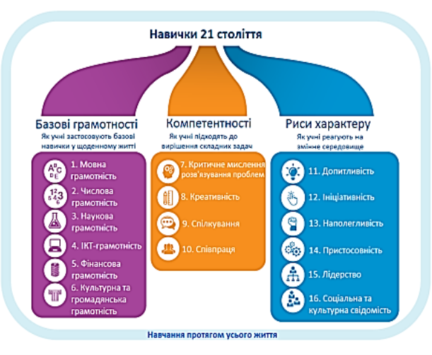 Основними цілями НУШ є компетентісний підхід у навчанні (Рис. Навички 21 століття): неперервна самоосвіта; нові інформаційні технології; вміння співпрацювати; перехід на профільне навчання; формування незалежної оцінки результатів навчання. Це спонукає, як уже зазначалось вище, до домінування в освіті процесів технологізації, візуалізації, персоналізації, диверсифікації, гейміфікації, тобто створення іншого освітнього середовища, ніж було притаманне так званій «старій школі» - школі індустріальної епохи, коли метою освіти було надати чим більшу кількість репродуктивних знань, коли від особистості не вимагалось особливої творчості, коли важливішим було підготувати відповідального виконавця.