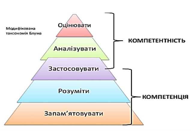 Тому й сучасні цілі навчання у когнітивній сфері (які ще називають елементами таксономії Блума), і які виражались через такі елементи засвоєння, як знання, розуміння, застосування, аналіз, синтез і оцінка, на сьогодні дещо модернізовані і піраміда пізнання містить ще й такі категорії як компетенції та компетентність.
