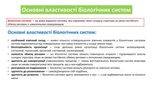 багаторівневість організації — існує декілька рівнів організації біологічних систем: молекулярний, клітинний, тканинний, органний, системний, організмовий;