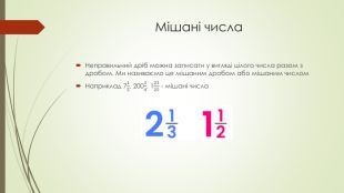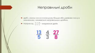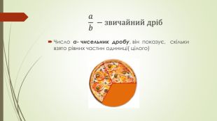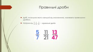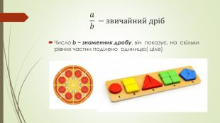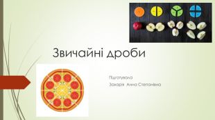 Презентація «Звичайні дроби» пояснює основні поняття про дроби для учнів. У ній подано визначення чисельника та знаменника, а також правила порівняння дробів з однаковими знаменниками. Крім того, розглядаються типи дробів: правильні, неправильні та мішані числа