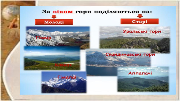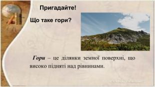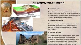 Як формуються гори?1. Тектонічні рухи. Тектонічні плити, що складають земну кору, постійно рухаються. Коли дві плити зіштовхуються, вони створюють величезні сили, які призводять до підняття земної кори й формування гір. 2. Вулканічні процеси. Деякі гори є результатом вулканічної активності. Коли магма проривається на поверхню, вона утворює вулкани. Вулканічні гори часто мають конічну форму. 3. Ерозійні процесиІнші гори можуть виникати внаслідок ерозії, коли вітер, вода та лід знищують слабкі породи, залишаючи позаду більш стійкі підвищення. Хоча ці процеси тривають дуже довго, вони можуть створювати захоплюючі ландшафти. Карпати в Україні частково формувались таким чином