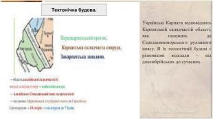 Гірські хребти Українських Карпат простягаються паралельними пасмами з північного заходу на південний схід. У їх межах науковці виділяють п’ять областей. Три області мають флішову будову і належать до Зовнішніх Карпат, а дві інші – до Внутрішніх Карпат, які складені метаморфічними та магматичними породами.https://learningapps.org/view5923479 Українські Карпати