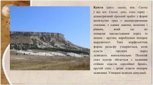 КРИМСЬКІ ГОРИ Кримські гори простягаються вздовж південного узбережжя Кримського півострова дугою, ширина якої близько 50 км. Їх найвища вершина – гора Роман-Кош – заввишки 1545 м. У рельєфі тут чітко виділяються три паралельні, витягнуті з південного заходу на північний схід, пасма. Зовнішнє пасмо має найменші висоти (250—350 м), а Внутрішнє дещо більші – 400-600 м. Найвищим є Головне пасмо (1200—1500 м). Вони мають північний пологий, а південний крутий схили. Таку форму рельєфу називають куестою.