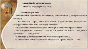 Актуалізація опорних знань. Прийом «Географічний крос» Закінчіть речення.- Найбільшими одиницями геологічного літочислення у геохронологічній таблиці є … .- Вік гірських порід, який визначають з урахуванням послідовності нашарування певних гірських порід, називають … .- Найдавніші геологічні відклади на території України поширені у межах … .- Гірські породи, що складають Українські Карпати та Кримські гори, мають переважно … походження.- На території України сейсмічно небезпечними районами є … .- На геологічних картах зазвичай не зображують гірські породи … віку.