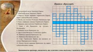 {D829 DBD7-8 A99-490 C-BE77-CF635 CA28 E82}57111346812921013 Прийом «Кросворд»1. Центральний масив Зовнішніх Карпат.2. Північний масив Зовнішніх Карпат.3. Округлі, безлісі вершини Українських Карпат, вкриті субальпійськими луками.4. Масив, що охоплює Рахівські і Чивчинські гори.5. Одна з найвищих масивів Українських Карпат.6. Вершина, двохтисячник Українських Карпат.7. Одна з яйл Кримських гір, сусідить з Ялтинською.8. Найвище пасмо Кримських гір.9. Друга назва Вигорлат-Гутинського хребта.10. Найвища вершина Кримських гір.11. Найвища яйла Кримських гір.12. Гори Українських Карпат, що належать до складу Мармароського масиву.13. Плоскі, безлісі вершини Кримських гір, вкриті субальпійськими луками. Заповнюючи кросворд, визначити, яке ключове слово виділено, і пояснити його значення.
