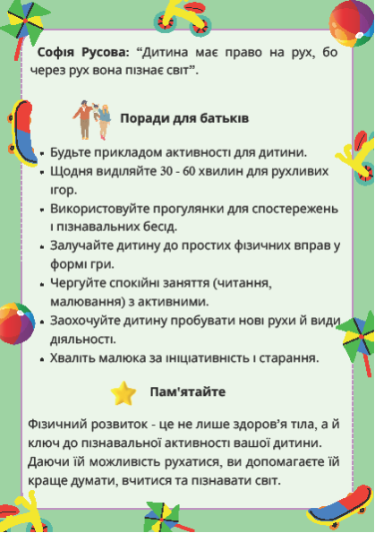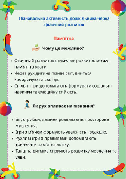 Пам'ятка для батьків "Пізнавальна активність дошкільника через фізичний розвиток"