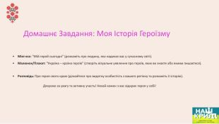 Домашнє Завдання: Моя Історія Героїзму. Міні-есе: "Мій герой сьогодні" (розкажіть про людину, яка надихає вас у сучасному світі). Малюнок/Плакат: "Україна – країна героїв" (створіть візуальне уявлення про героїв, яких ви знаєте або якими пишаєтеся). Розповідь: Про героя свого краю (дізнайтеся про видатну особистість з вашого регіону та розкажіть її історію). Дякуємо за увагу та активну участь! Нехай кожен з вас відкриє героя у собі!