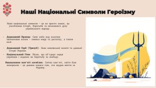 Наші Національні Символи Героїзму. Наші національні символи – це не просто знаки, це уособлення історії, боротьби та незламного духу українського народу. Державний Прапор: Синє небо над золотим пшеничним полем – символ миру та достатку, а також волі. Державний Герб (Тризуб): Знак князівської величі та давньої історії України. Національний Гімн: Пісня, що об'єднує серця українців і надихає на боротьбу за свободу. Вшанування пам’яті загиблих: Свічка пам’яті, квіти біля меморіалів – це данина поваги тим, хто віддав життя за Україну.