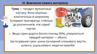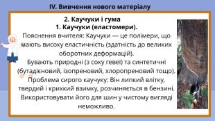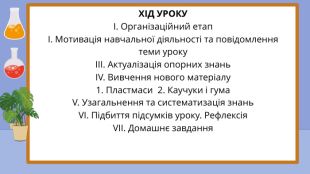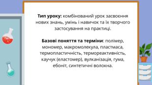 Навчальна: сформувати уявлення про найважливіші групи синтетичних високомолекулярних сполук — пластмаси, каучуки та волокна; розглянути їх класифікацію, склад, властивості та основні сфери застосування; розкрити суть процесу вулканізації; навчити розрізняти термопластичні та термореактивні полімери.