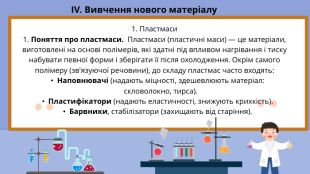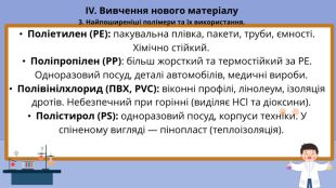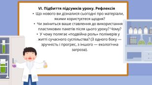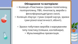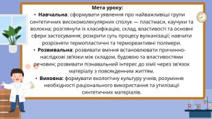 Виховна: формувати екологічну культуру учнів, розуміння необхідності раціонального використання та утилізації синтетичних матеріалів.