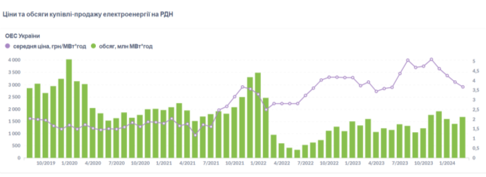 Проаналізуйте дані стовпчикової діаграми. Зазначте рік / ціна MAX та MIN ціновий показник купівлі-продажу електроенергії в Україні .
