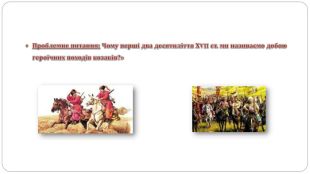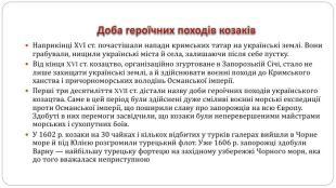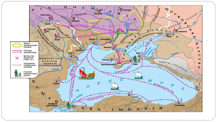 Доба героїчних походів козаків. Наприкінці ХVІ ст. почастішали напади кримських татар на українські землі. Вони грабували, нищили українські міста й села, залишаючи після себе пустку. Від кінця XVI ст. козацтво, організаційно згуртоване в Запорозькій Січі, стало не лише захищати українські землі, а й здійснювати воєнні походи до Кримського ханства і причорноморських володінь Османської імперії. Перші три десятиліття XVII ст. дістали назву доби героїчних походів українського козацтва. Саме в цей період були здійснені дуже сміливі воєнні морські експедиції проти Османської імперії, що поширили славу про запорожців на всю Європу. Здобуті в них перемоги засвідчили, що козаки були неперевершеними майстрами морських і сухопутних боїв. У 1602 р. козаки на 30 чайках і кількох відбитих у турків галерах вийшли в Чорне море й під Юлією розгромили турецький флот. Уже 1606 р. запорожці здобули Варну — найбільшу турецьку фортецю на західному узбережжі Чорного моря, яка до того вважалася неприступною