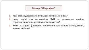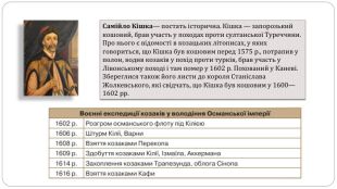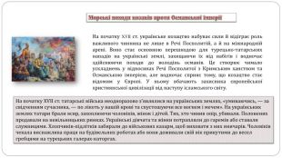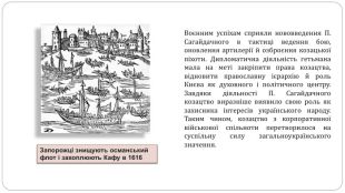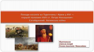 Загальний висновок У першій половині XVII ст. запорозьке козацтво перетворилося на силу, яка могла не лише успішно відбивати татарсько-турецькі набіги на українські землі, а й здійснювати далекі сухопутні й морські походи до Криму та Османської імперії. Найвідомішим провідником українського козацтва перших десятиліть XVII ст. став гетьман Петро Конашевич-Сагайдачний. Під час Хотинської війни запорозьке козацтво засвідчило свою здатність відігравати роль впливового чинника міжнародного життя. Також козацтво взяло активну участь у війнах Речі Посполитої з Московською державою та Шведським королівством. Завдяки козацтву Польща отримали додаткове 40-тисячне професійне військо, яке забезпечувало воєнну перевагу.
