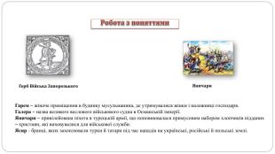 Робота з поняттями. Герб Війська Запорозького. Яничари. Гарем – жіноче приміщення в будинку мусульманина, де утримувалися жінки і наложниці господаря. Галера – назва великого веслового військового судна в Османській імперії. Яничари – привілейована піхота в турецькій армії, що поповнювалася примусовим набором хлопчиків підданих – християн, які виховувалися для військової служби. Ясир - бранці, яких захоплювали турки й татари під час нападів на українські, російські й польські землі.
